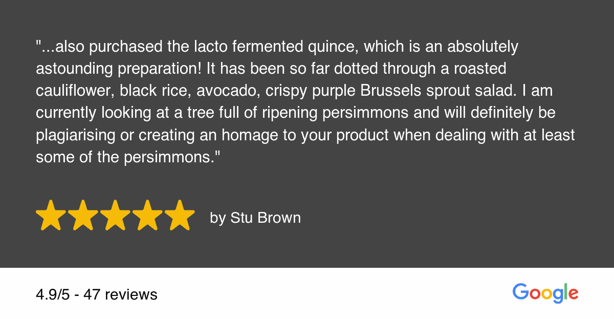 This ferment has a fresh & firm texture that is packed with gut-healthy fibre. The aromatic qualities & tartness of the quince shine through. The cinnamon & pepper add a delicate punch that does not overwhelm and complements the Quince in a most delectable way. It is a well-balanced ferment with a rich array of delicate flavours and textures. This means it plays well with either sweet or savoury dishes.