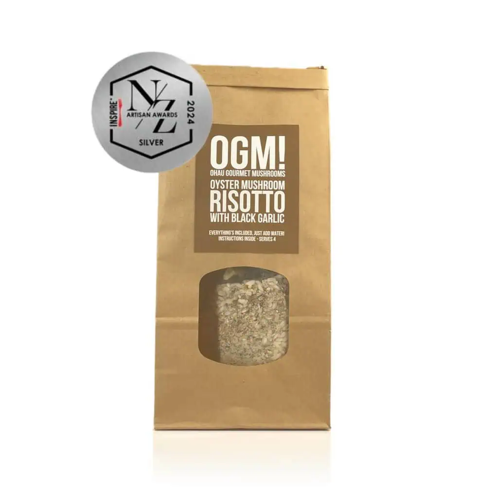 This risotto features Oyster Mushrooms grown on our permaculture farm in Ohau, and Black Garlic we make ourselves. These culinary stars work together to create an incredible aroma, taste, and creamy texture. The Black Garlic adds a stunning dark colour and an incredible Umami yet sweet flavour that perfectly complements the Oyster Mushrooms.